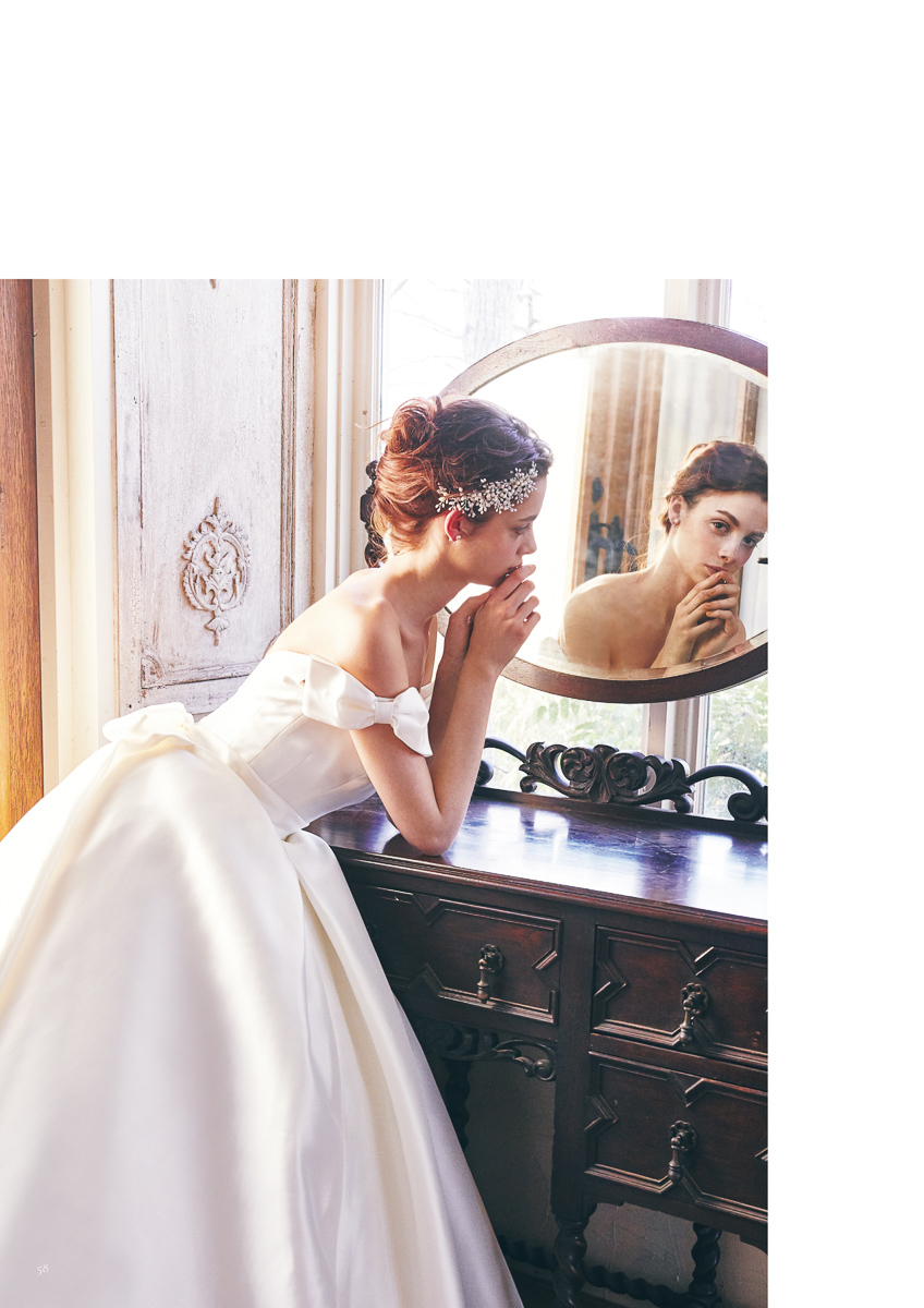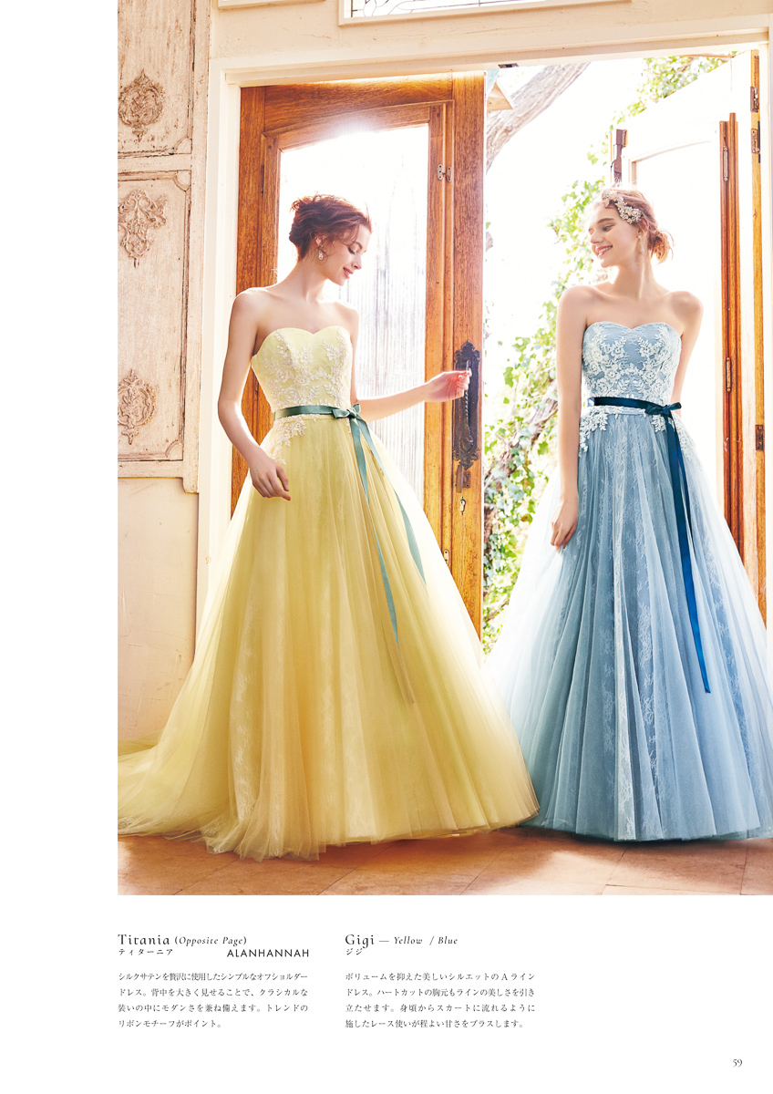 - シルクサテンを贅沢に使用したシンプルなオフショルダードレス。背中を大きく見せることで、クラシカルな装いの中にモダンさを兼ね備えます。トレンドのリボンモチーフがポイント。