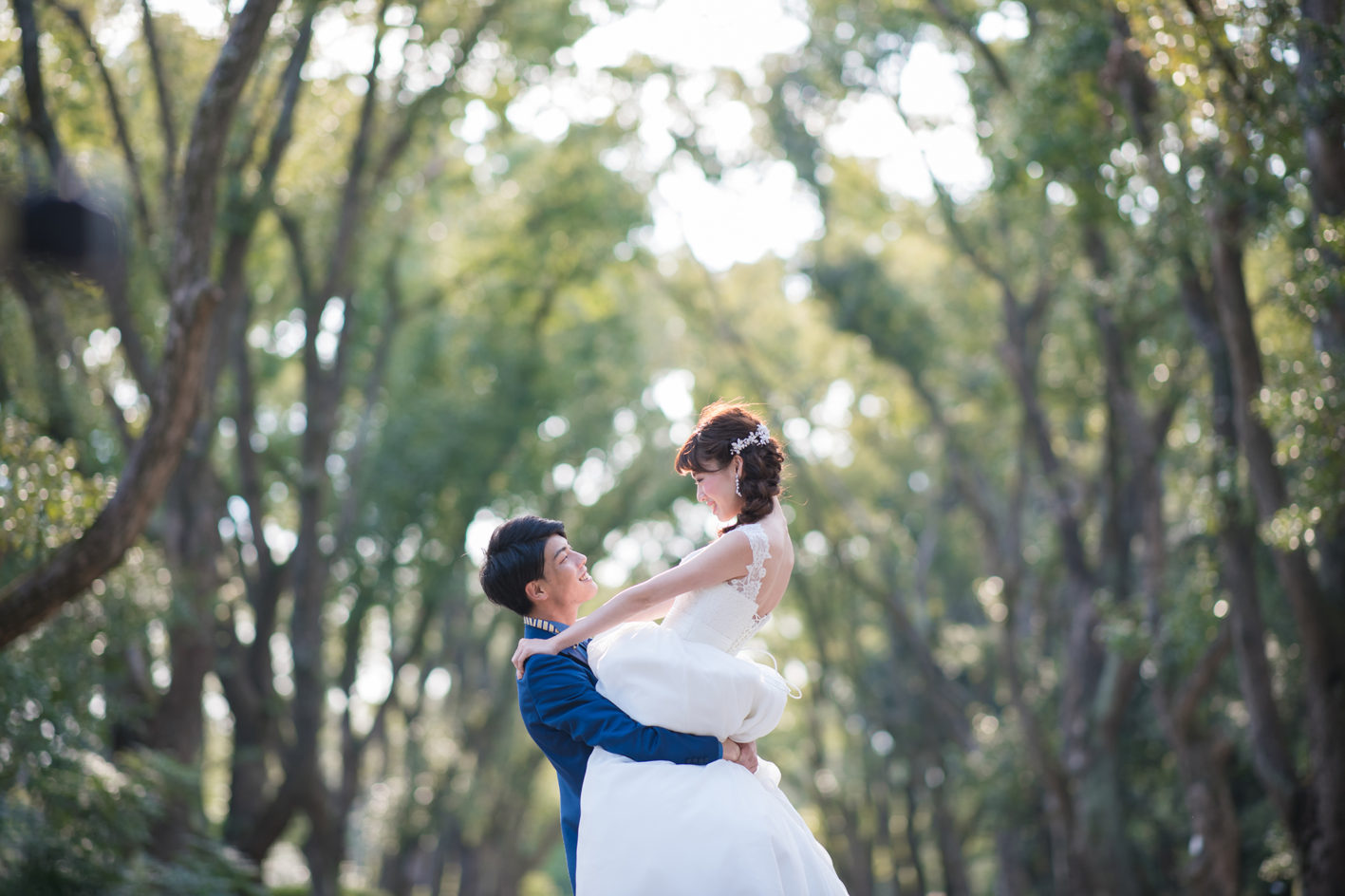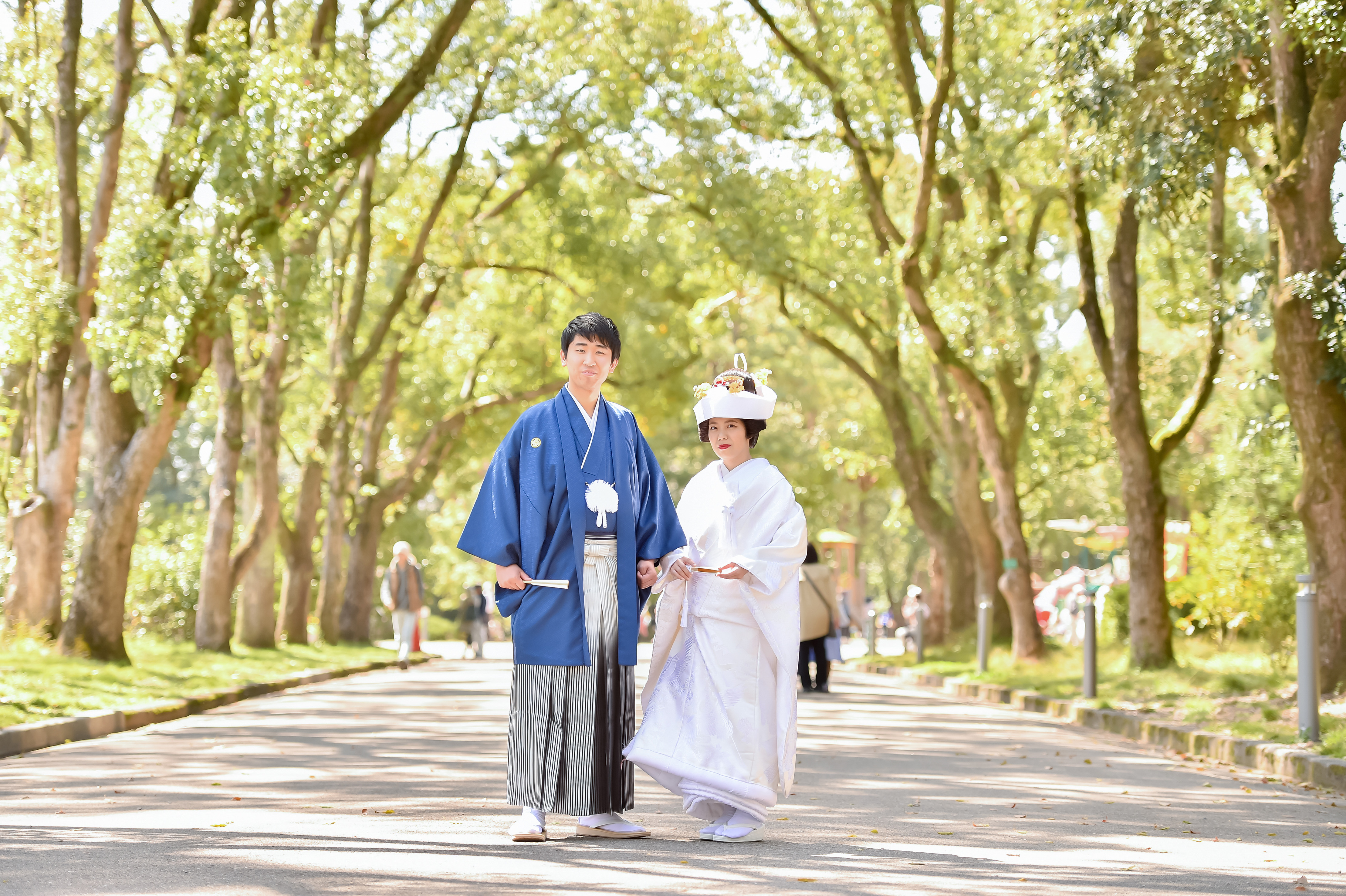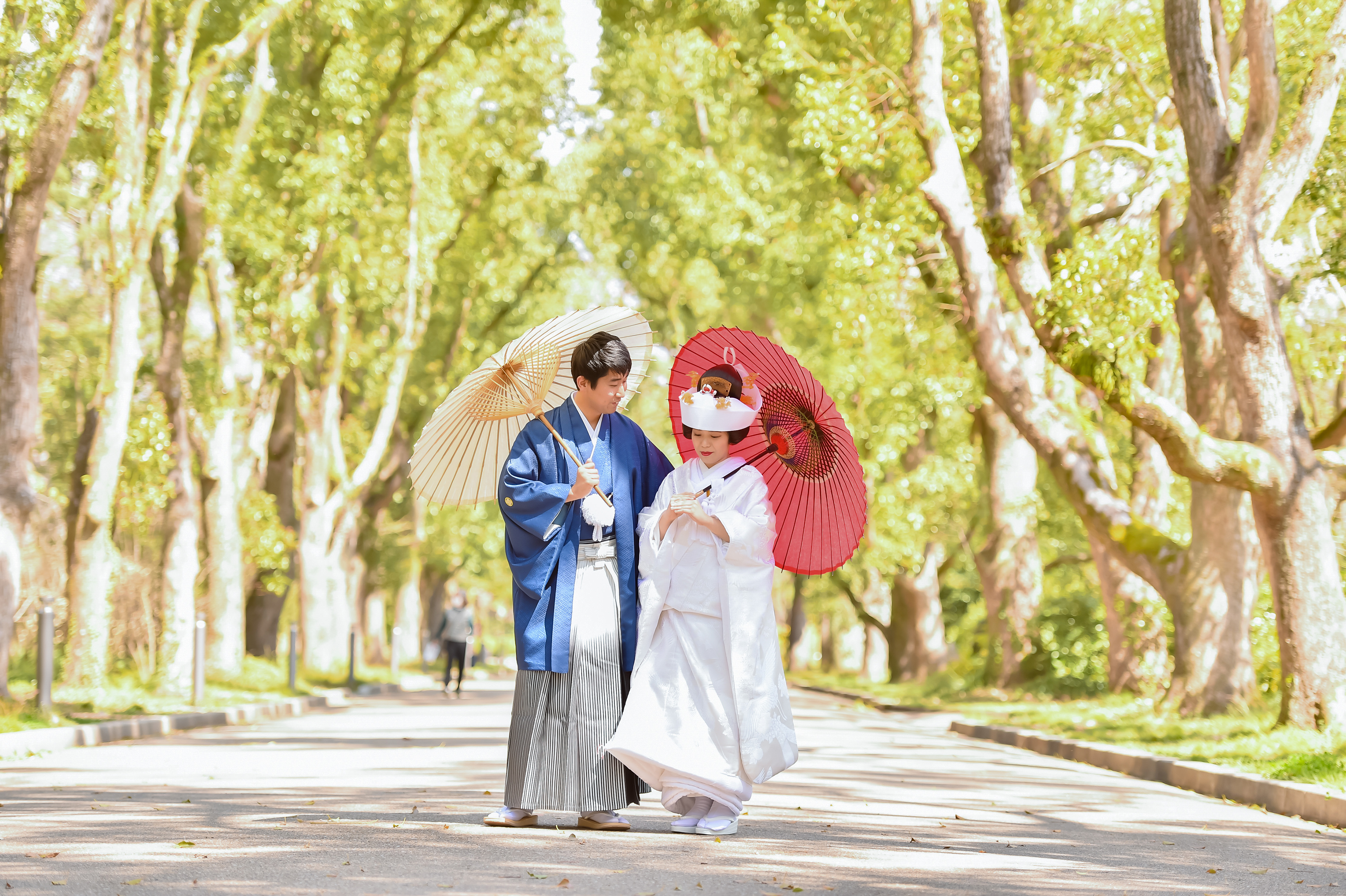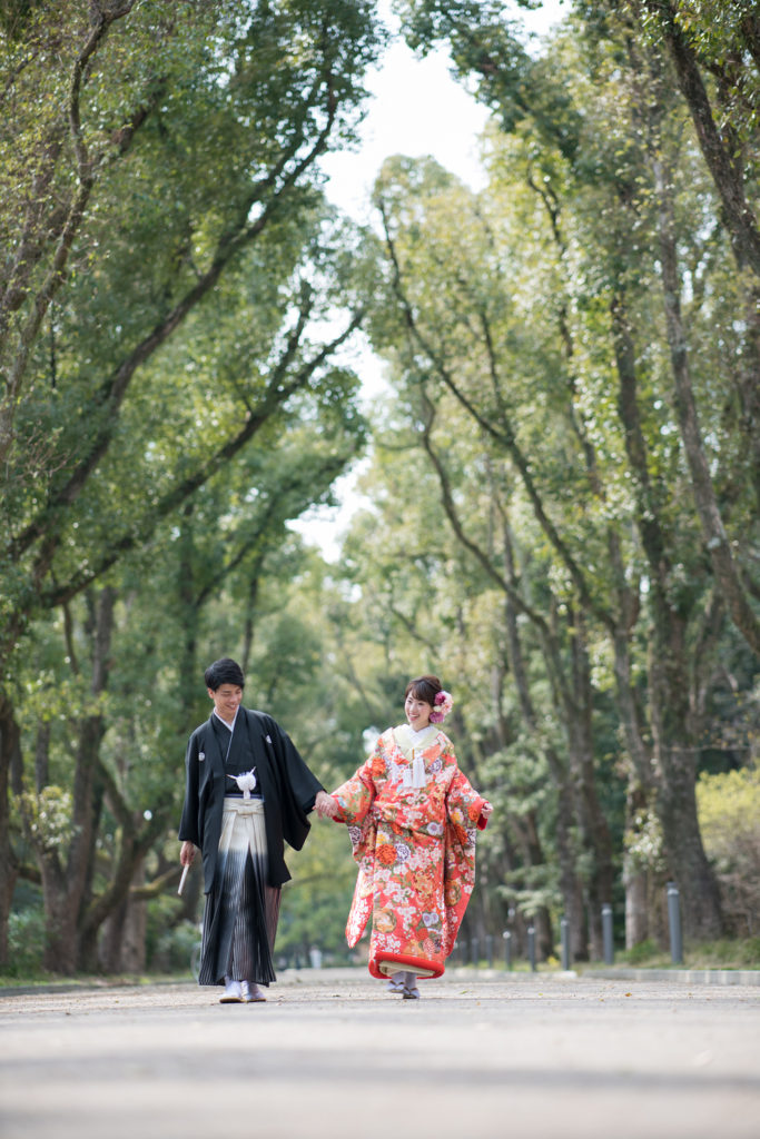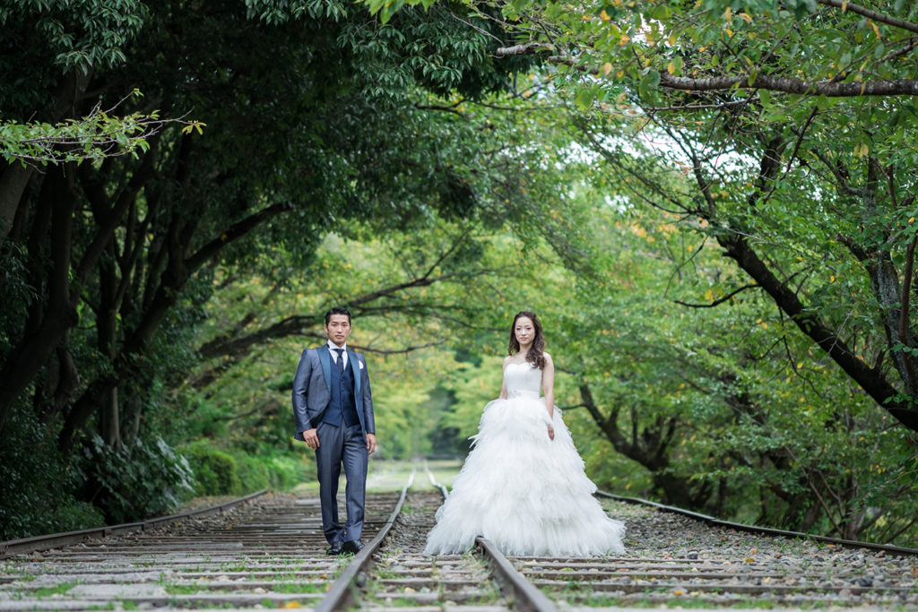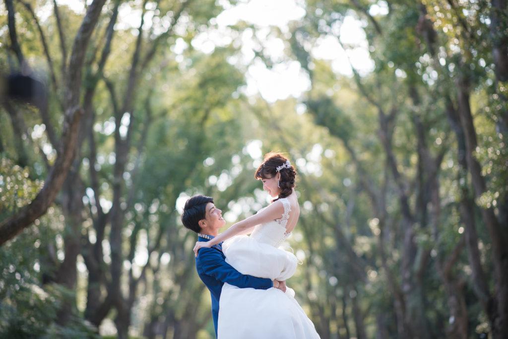 グリーンの爽やかな並木道。 気持ちも晴れ晴れと、自然体なお二人の表情が引き出されます。