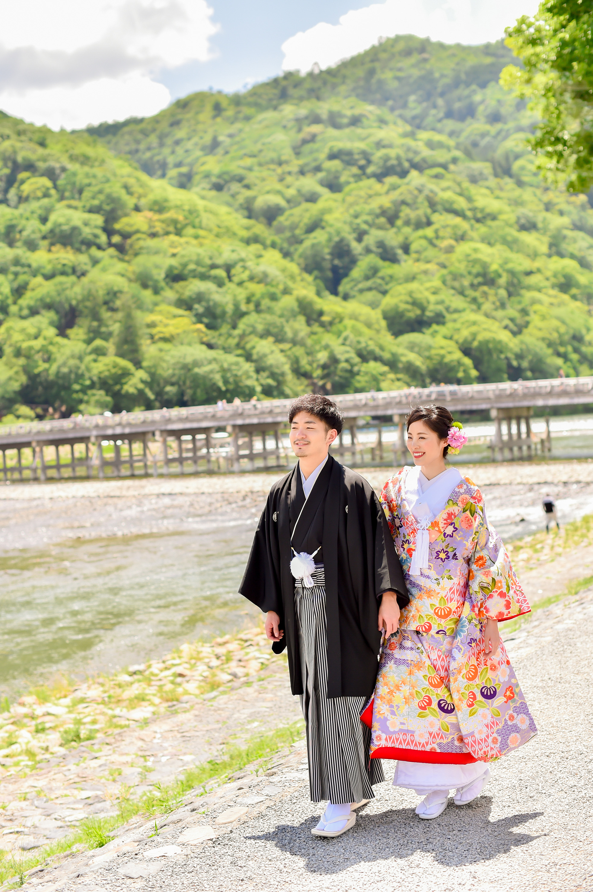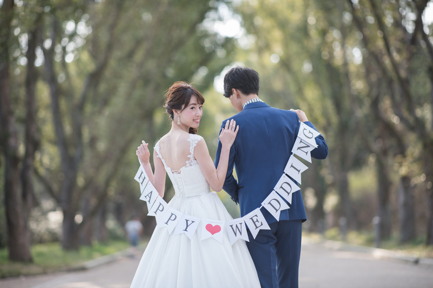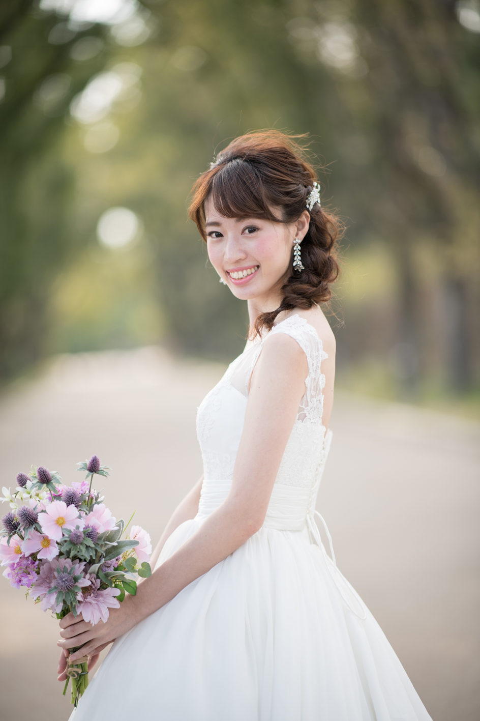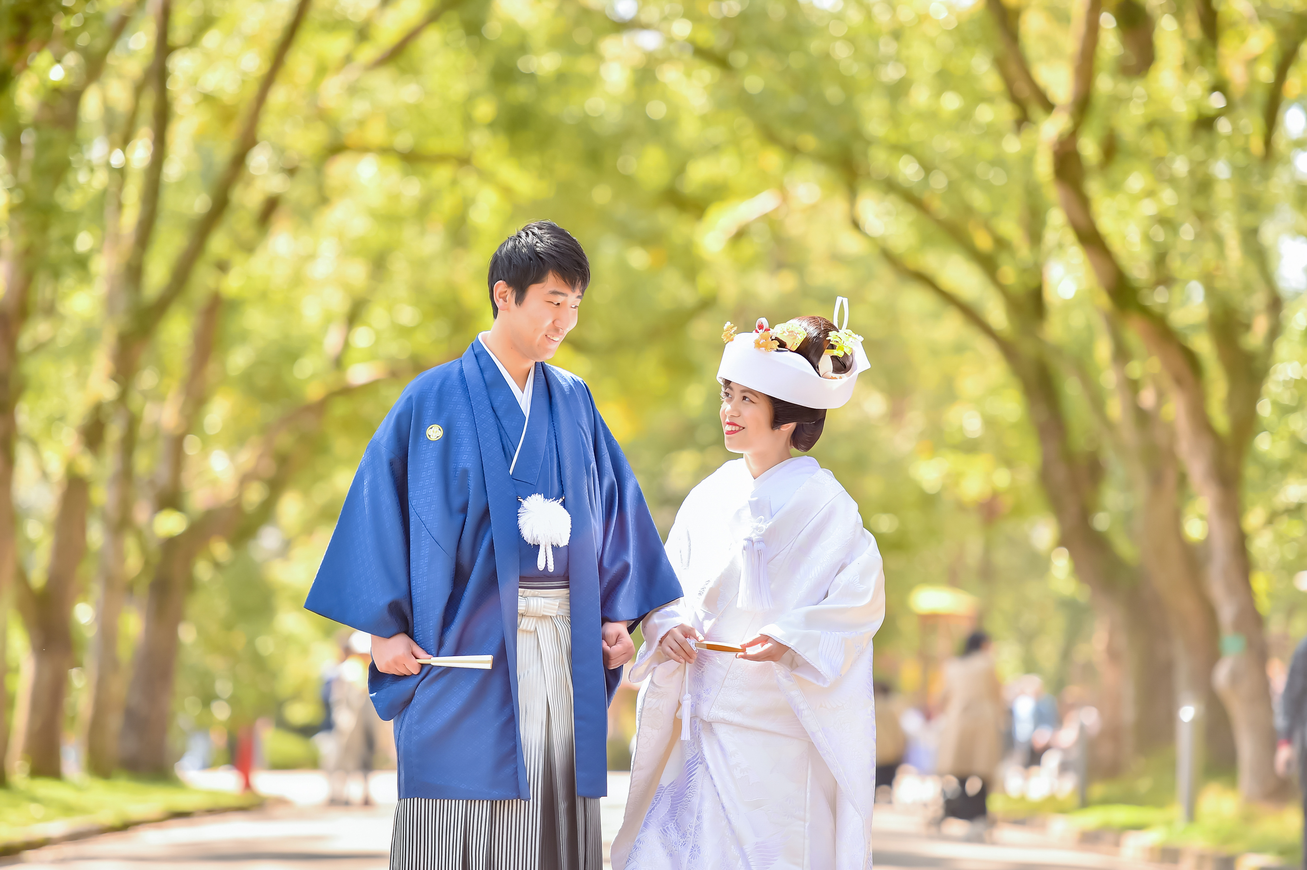 グリーンの爽やかな並木道。 気持ちも晴れ晴れと、自然体なお二人の表情が引き出されます。