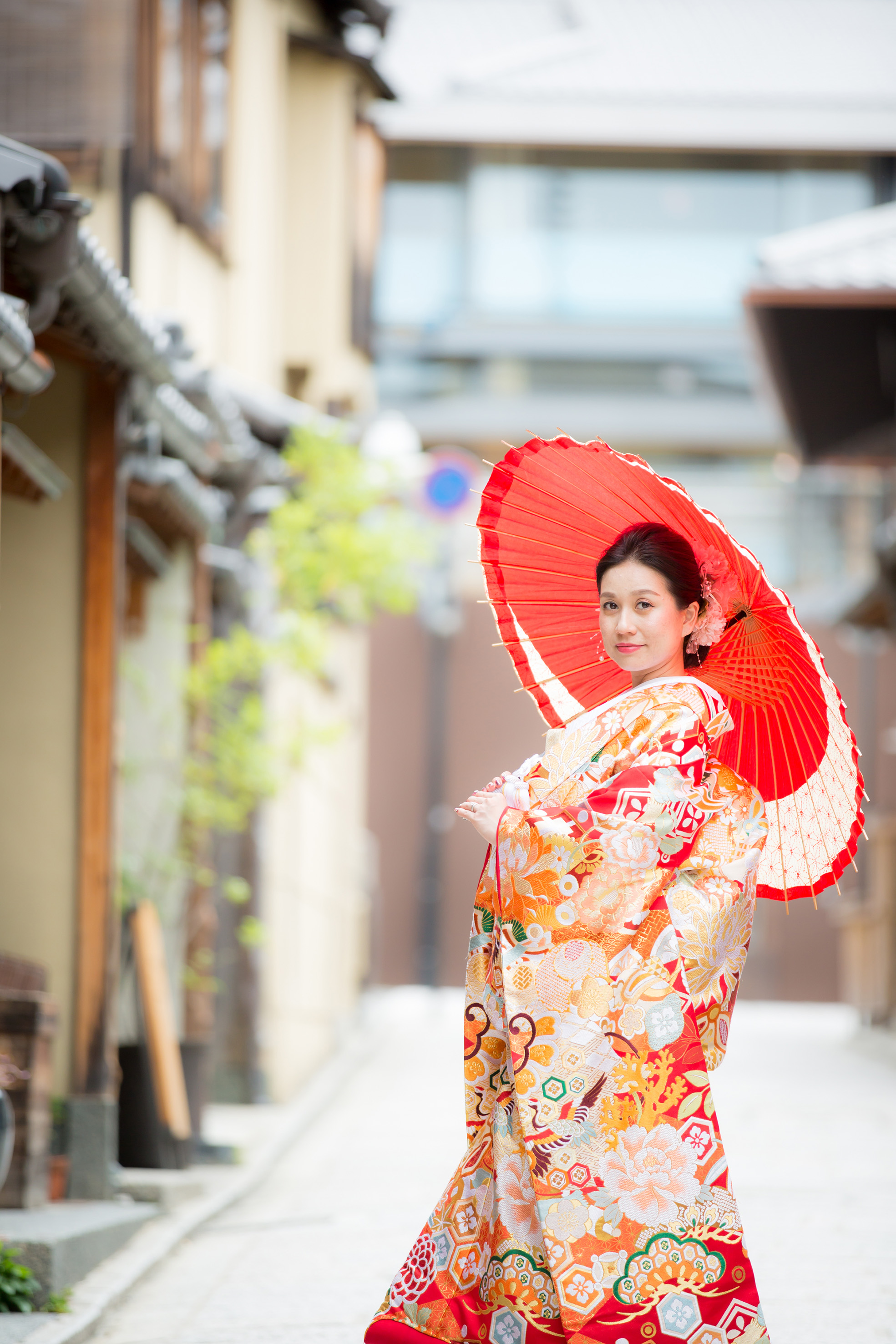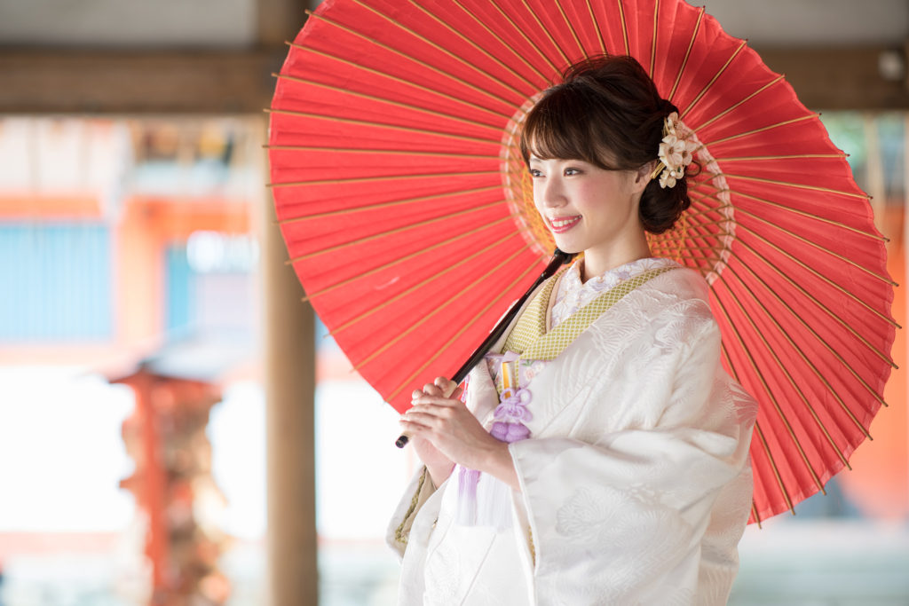 神社と番傘は愛称バツグン! しっとりとご新婦様お一人のショットも織り交ぜて。