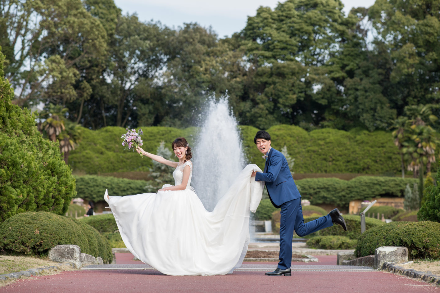 噴水も演出に一役かってくれる立役者。 お二人が楽しい瞬間は写真でもしっかりと伝わるのですよ。