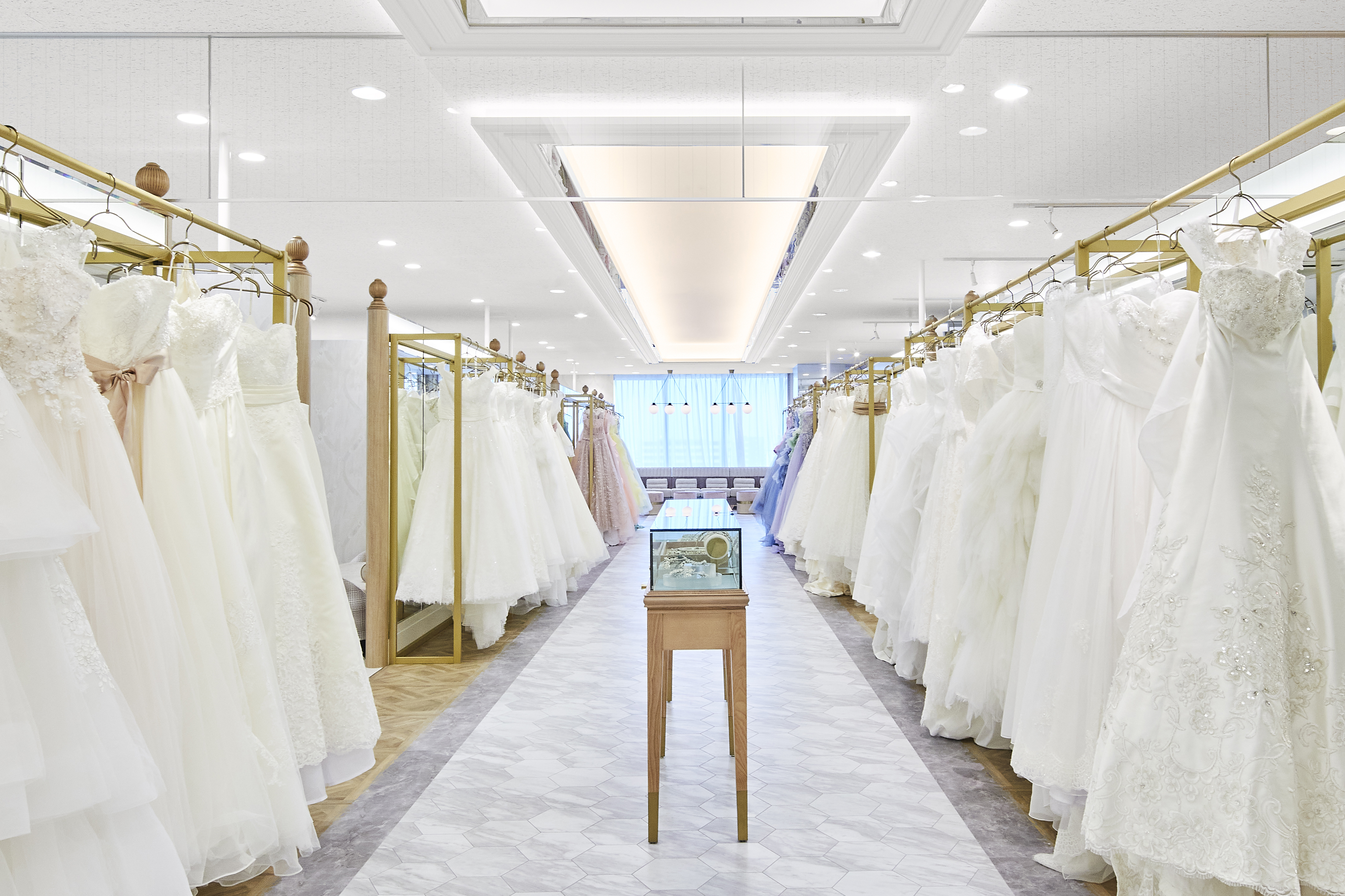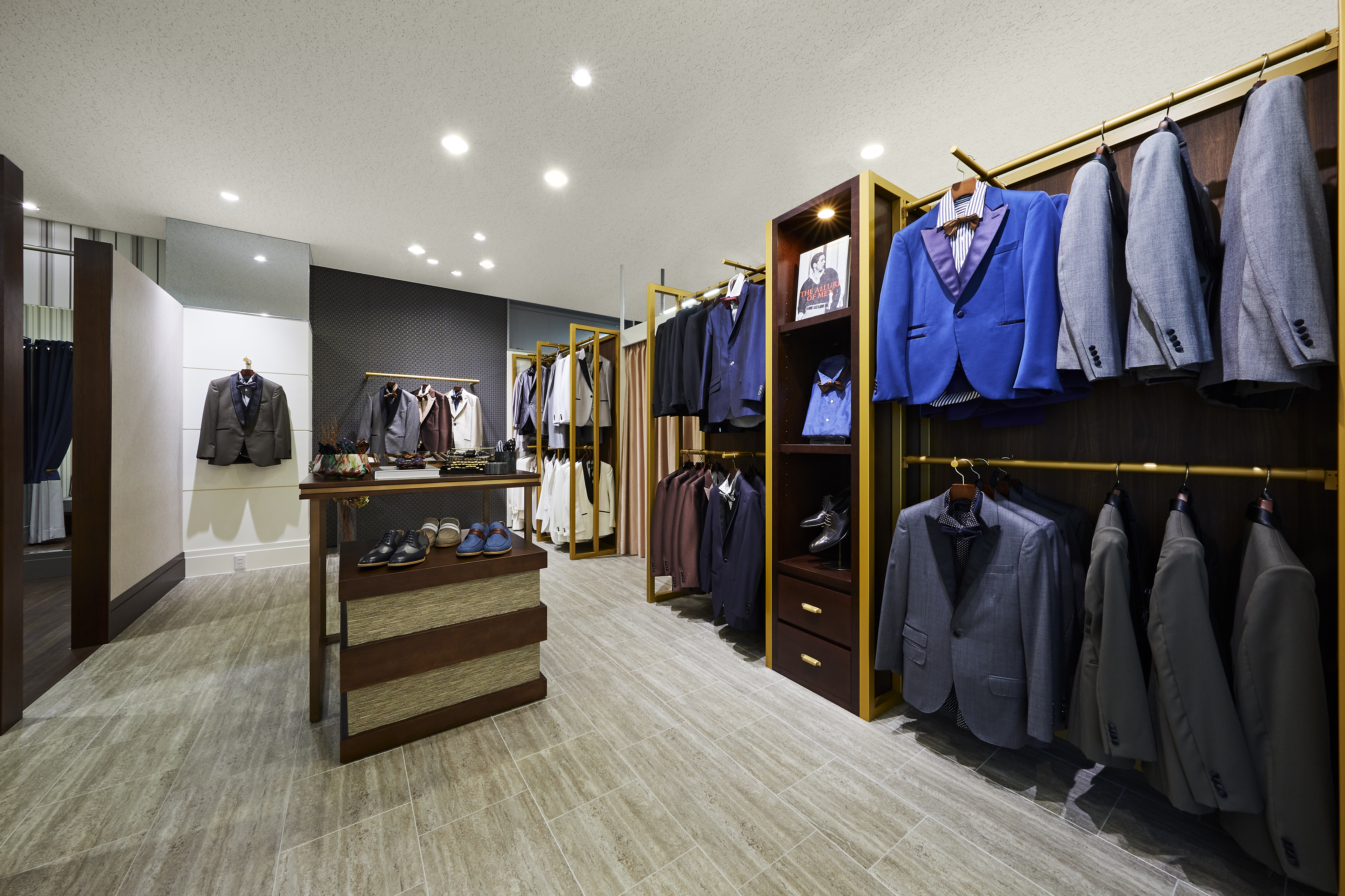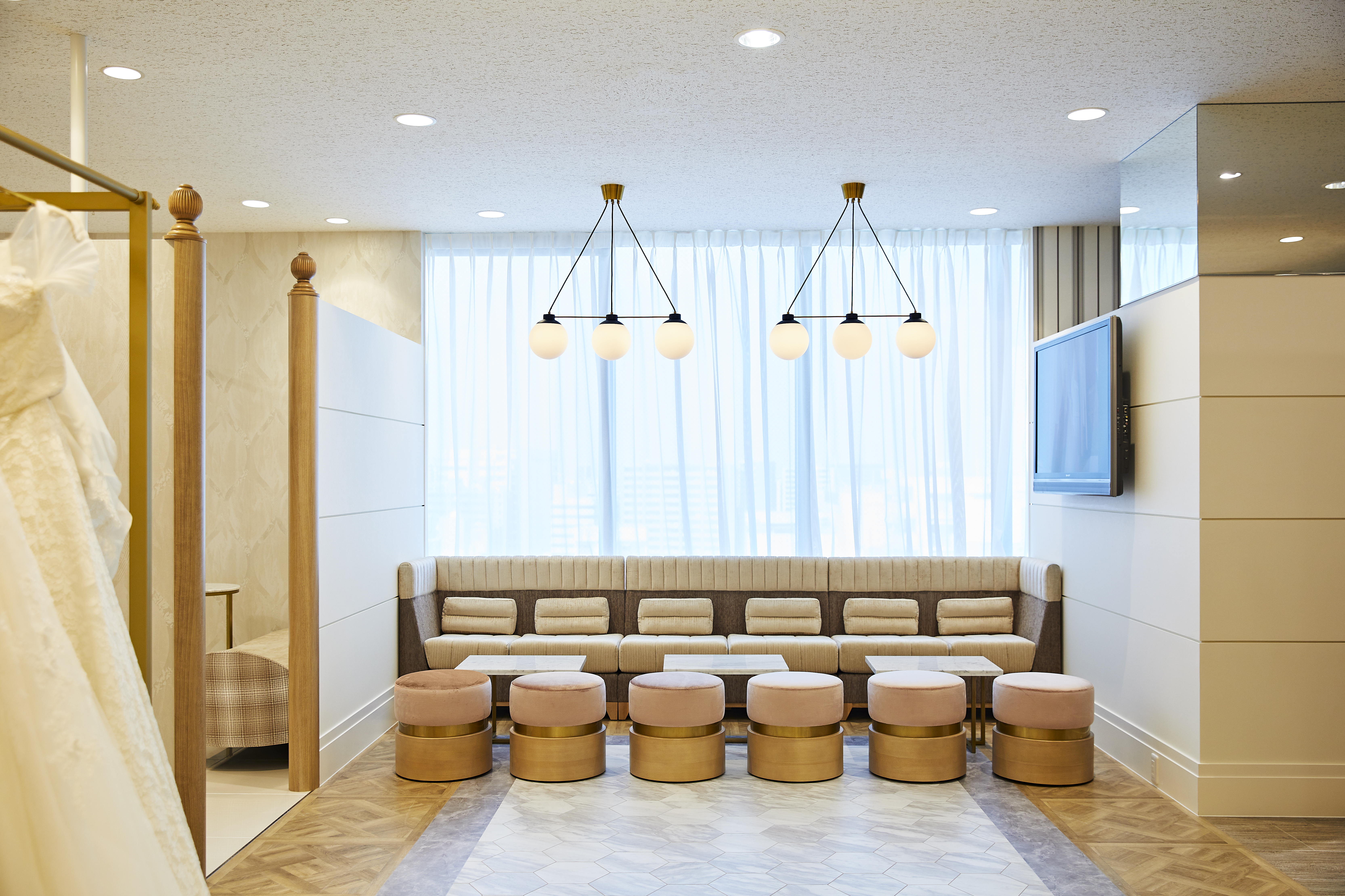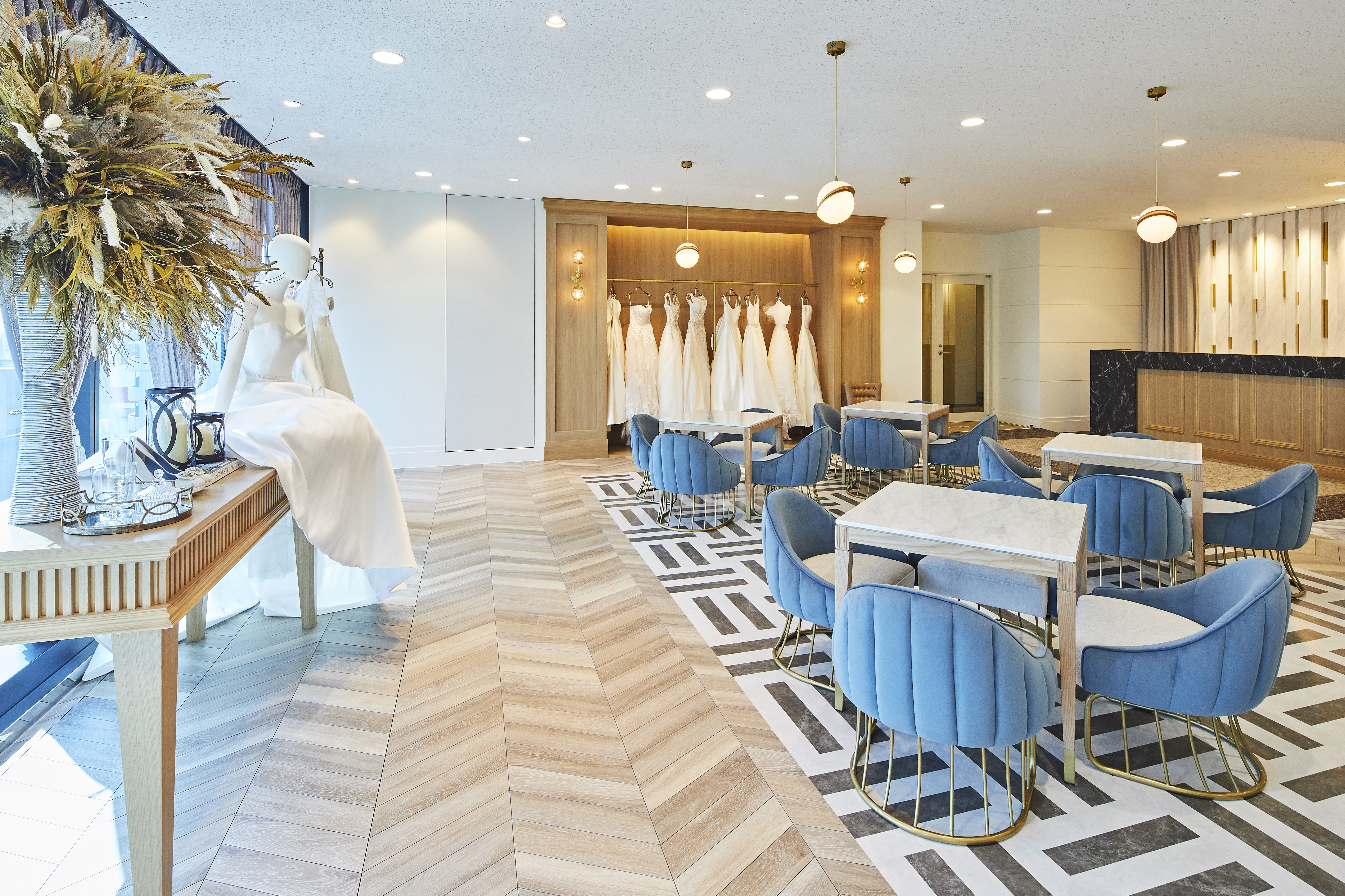 ドレスルーム、和装室に加えアパレルショップをイメージしたメンズルーム、シンプルな壁面にドレスが映えるフォトスポット、お連れ様もゆったりと過ごせるウェイティングスペースを新たに完備しました。