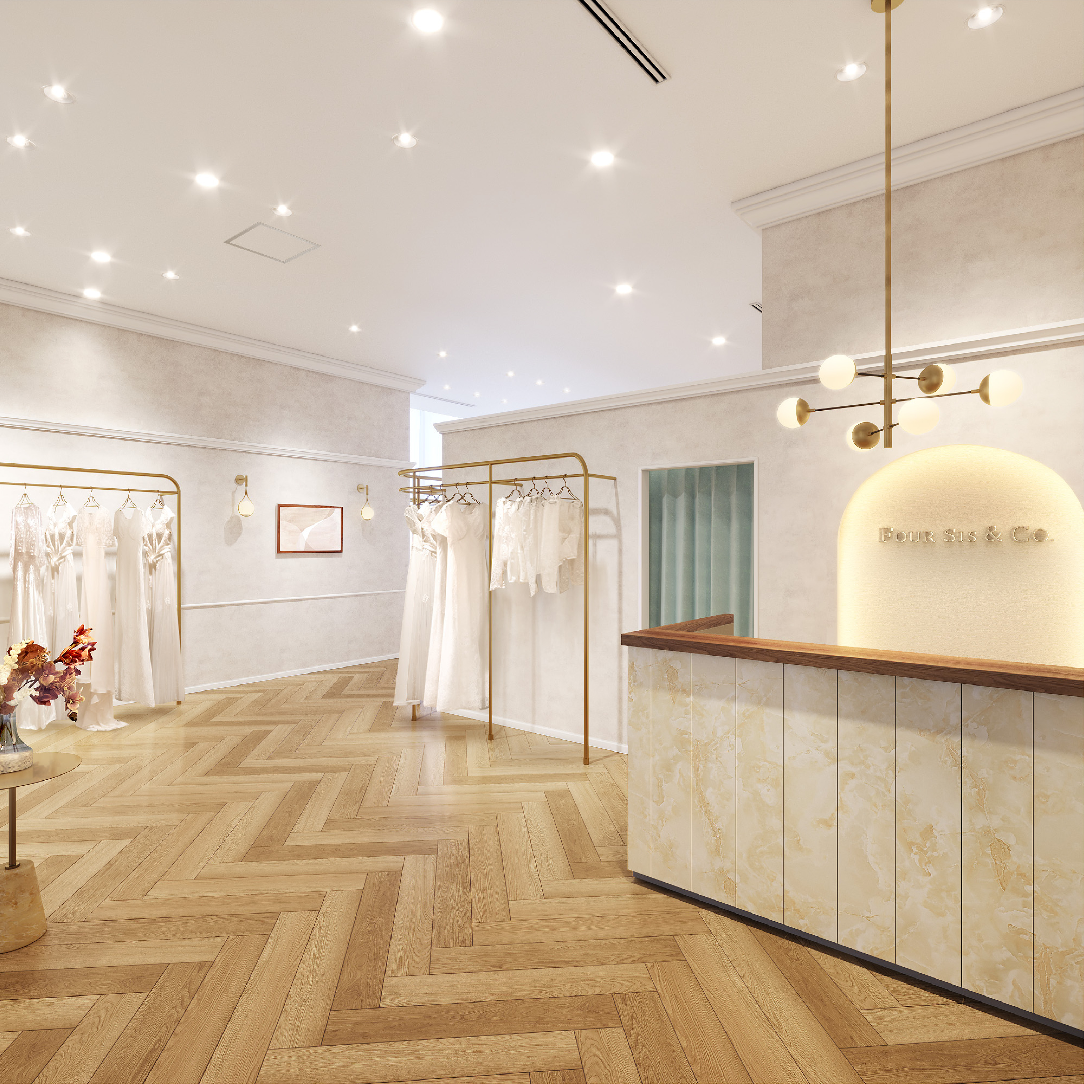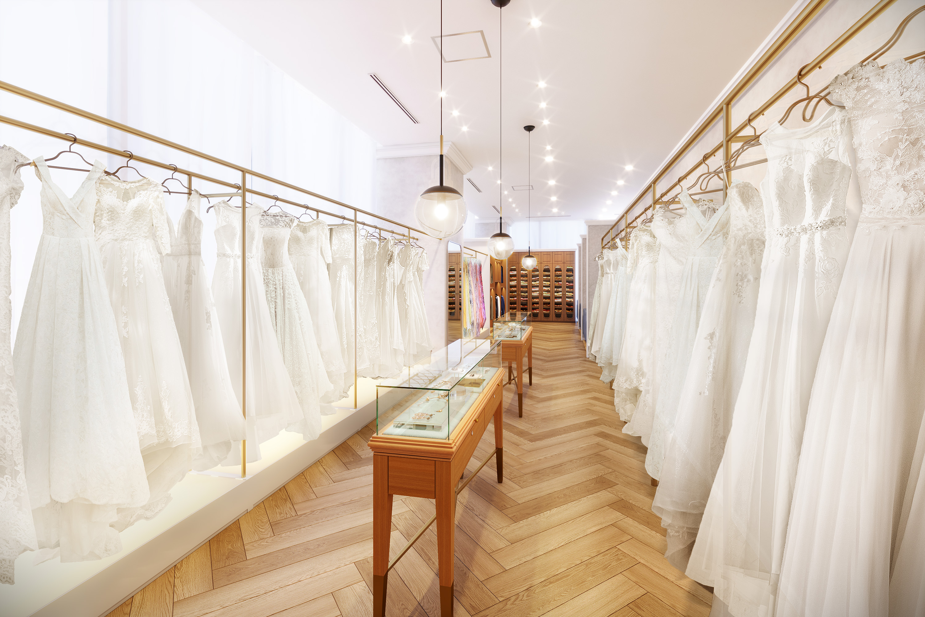 ナチュラルカラーの壁面や温かい木のぬくもりに包まれた空間に、数々のウェディングドレスやカラードレス、アクセサリーが並びます。